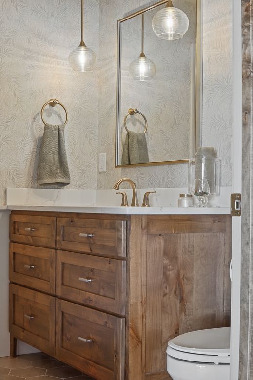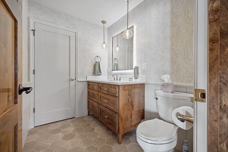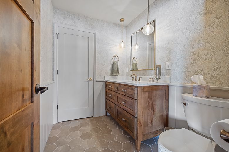 half bath with dreamy wallpaper
